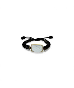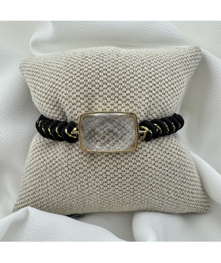 Pulsera oro 18kt amarillo y cristal de roca con macramé color negro y dorado.