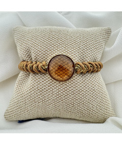 Pulsera oro 18kt amarillo y cuarzo con macramé color marrón y dorado.