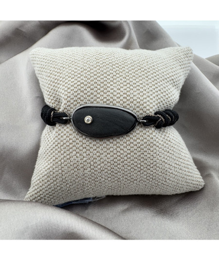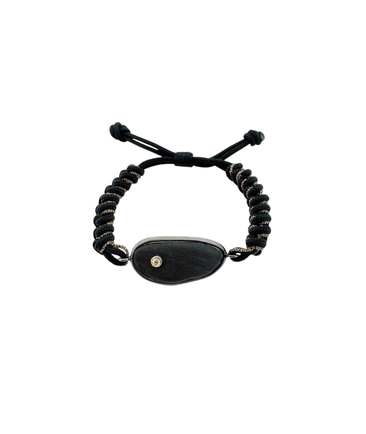 Pulsera con piedra, plata de ley y brillante con boca de oro amarillo 18kt y macramé color negro.