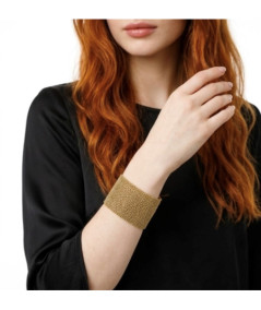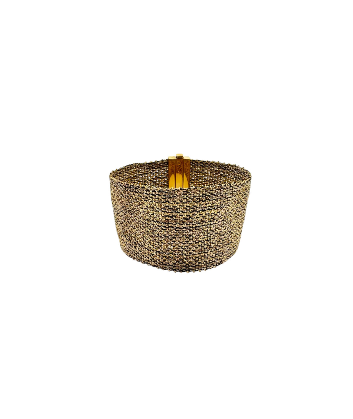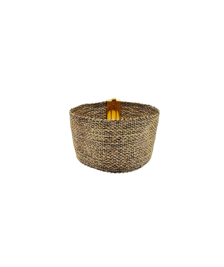 Pulsera ancha de plata de ley dorada y hilo seda marrón .