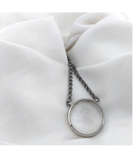 Colgante de cuarzo facetado de 27 mm de diámetro con cadena de plata negra de ley de 39 cm de largo