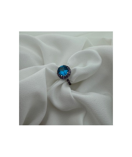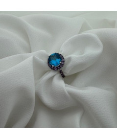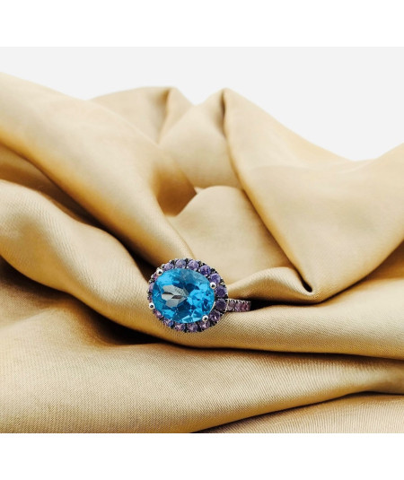 Anillo de oro blanco de 18 Kt con topacio azul central de 10 x 8 mm y zafiros rosas