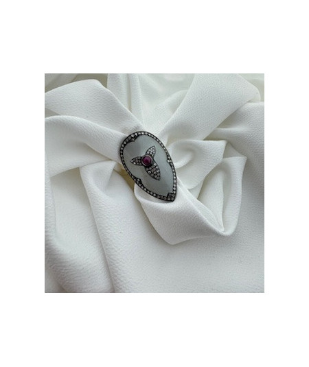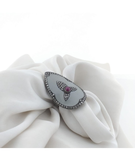 Anillo plata de ley de 38x23 mm, con esmalte azulado,brillantes y rubi cabuixón central.