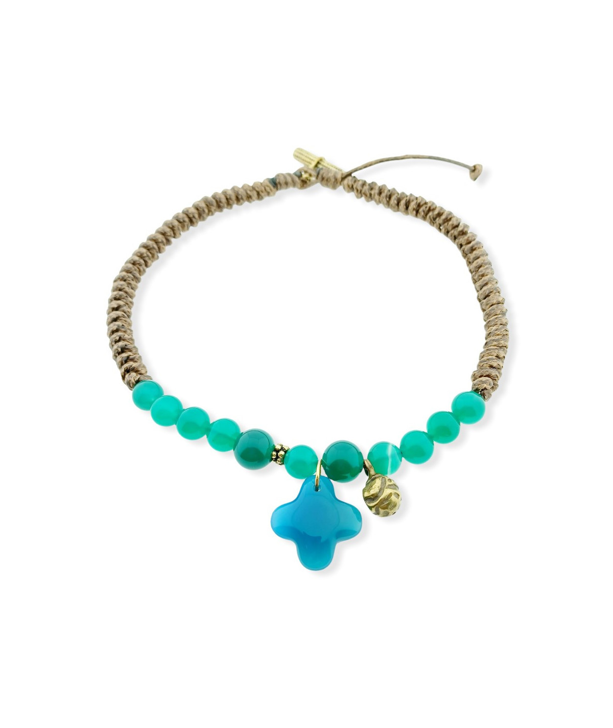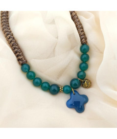 Collar bolas y cruz central de ágata verde, piezas de bronce y cordón marrón trenzado de 42 cm de largo.
