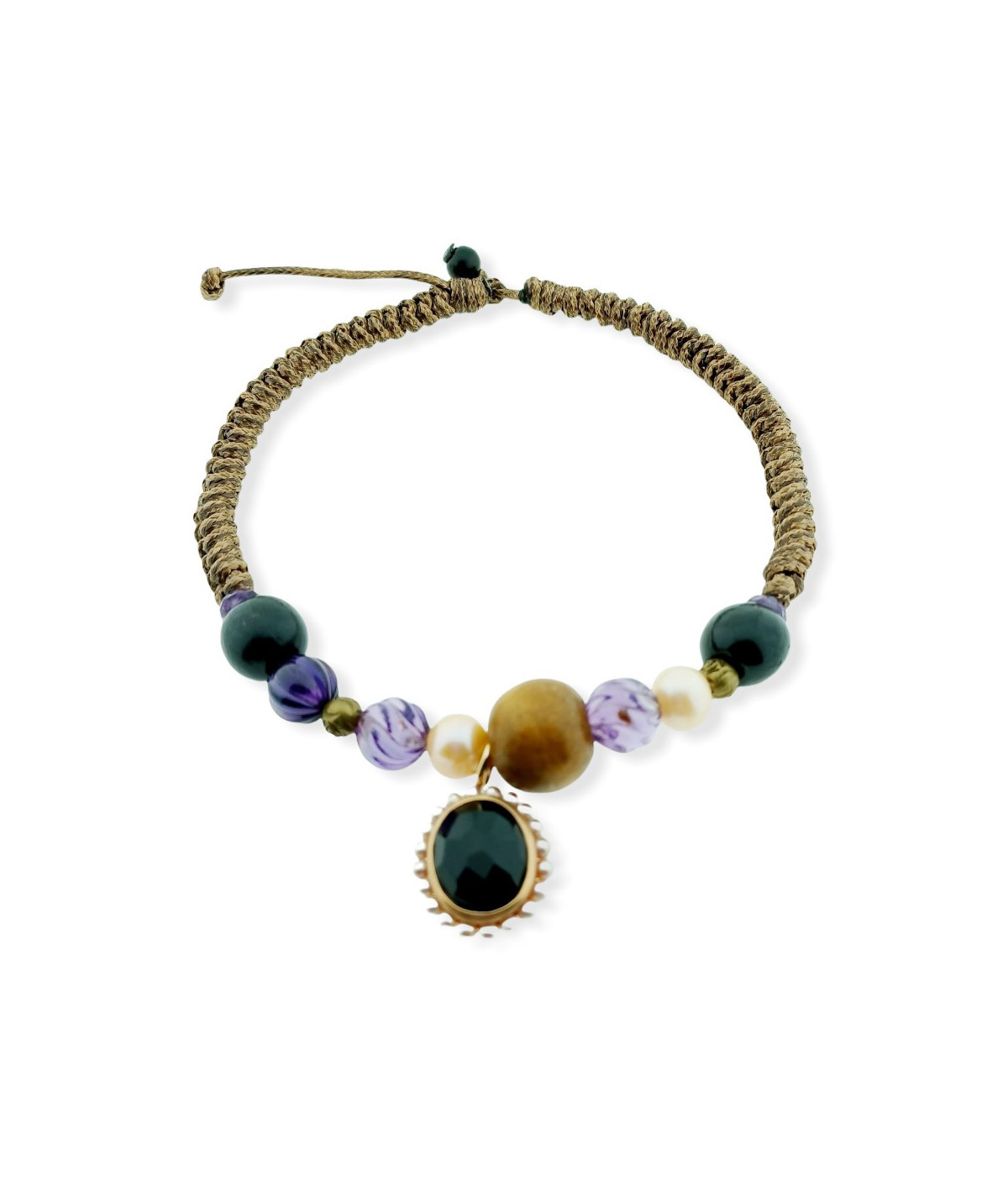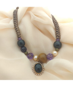 Collar con medallón central en oro de 18 kt con perlas y ónix, perlas, bolas facetadas de amatista y bolas de ébano y bronce, con cordón trenzado marrón de 42 cm de largo.