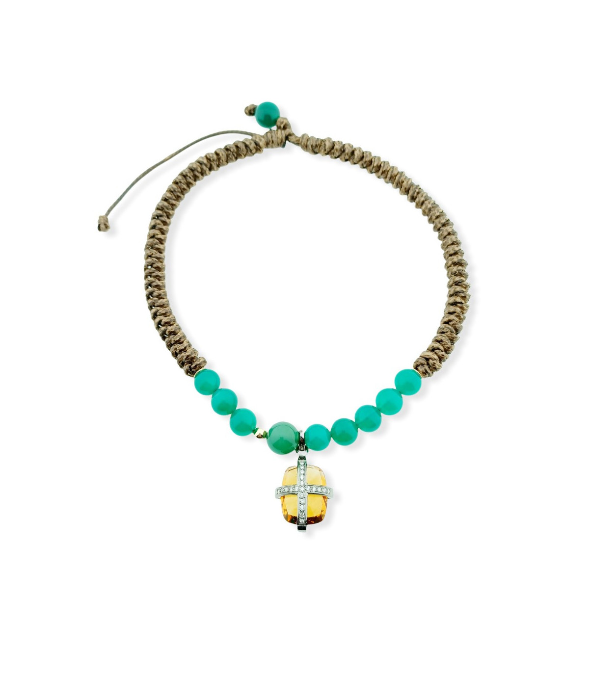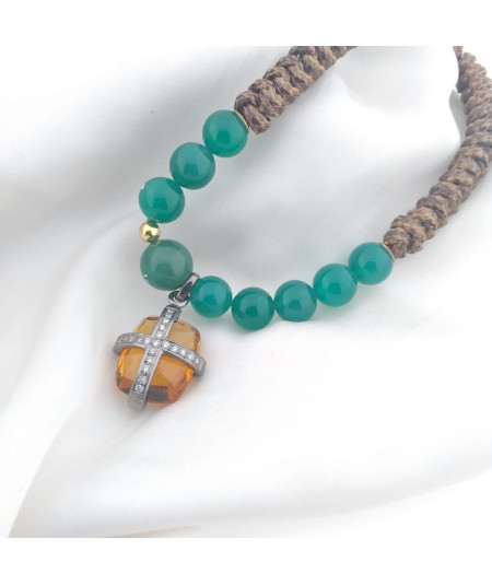 Collar con medallón central en topacio y brillantes montado en oro blanco de 18 kt , ágatas verdes y bronce con cordón trenzado marrón de 42 cm de largo.