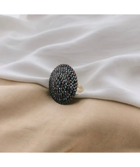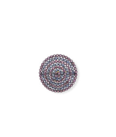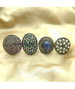 Anillo redondo de 30 mm de diámetro en plata y oro de ley con zafiros de color rosa y azul.