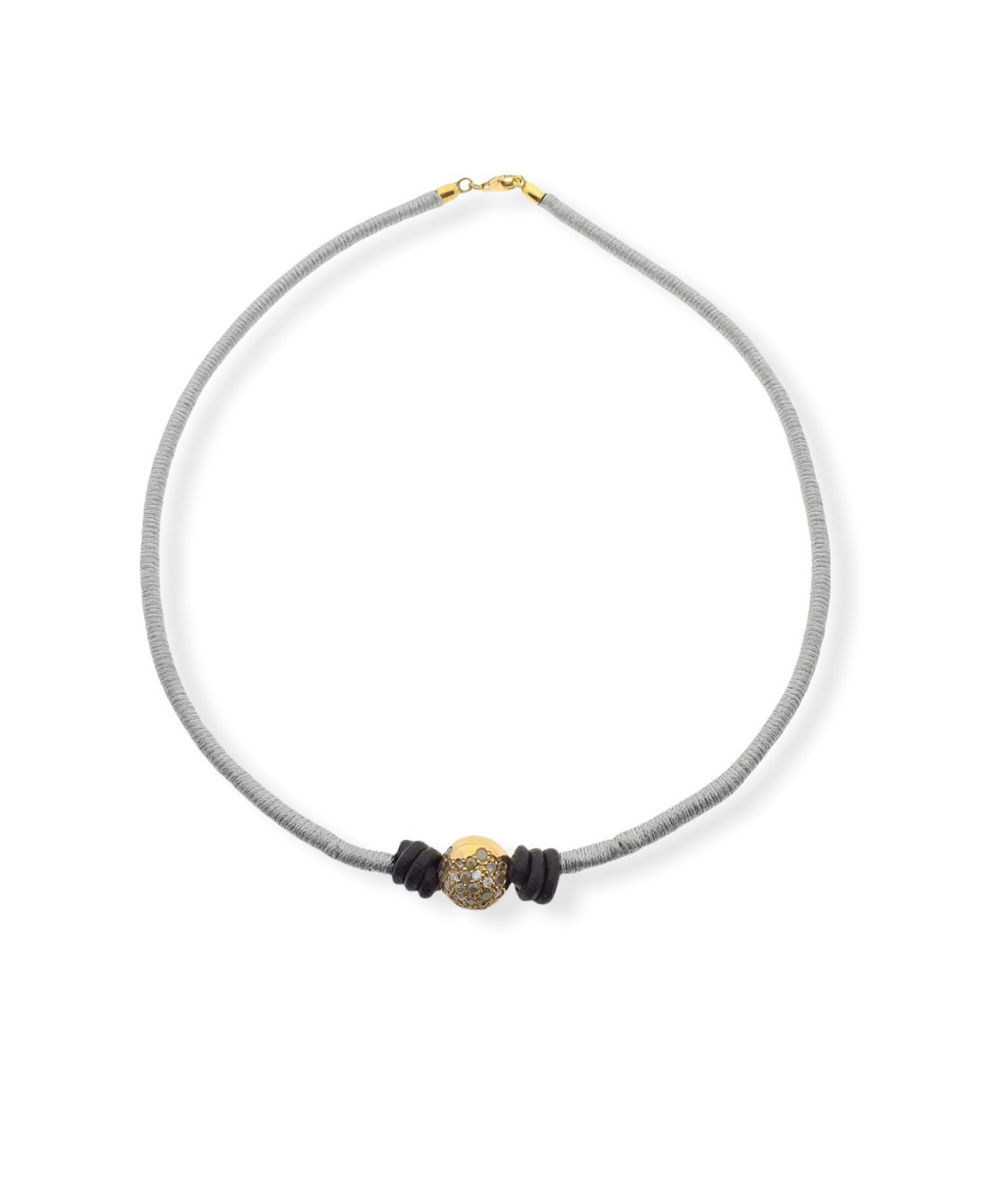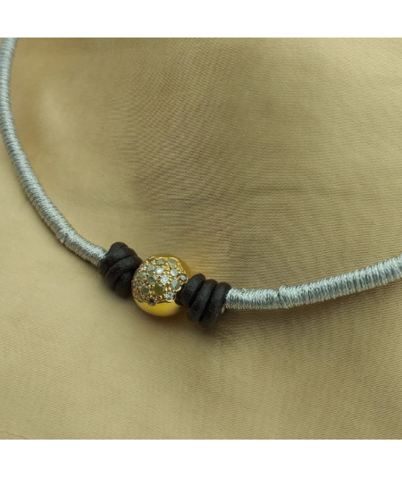 Collar oro amarillo 18 kt con bola de brillantes grises y cordón de cuero marrón recubierto de cordón color plata.