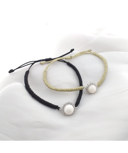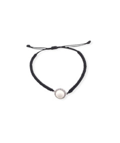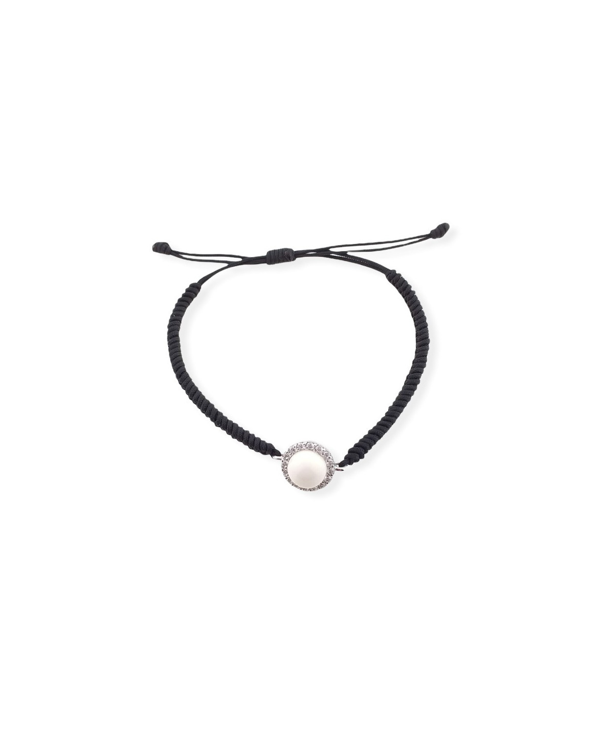 Pulsera en oro coral blanco y brillantes con cordón makramé negro.