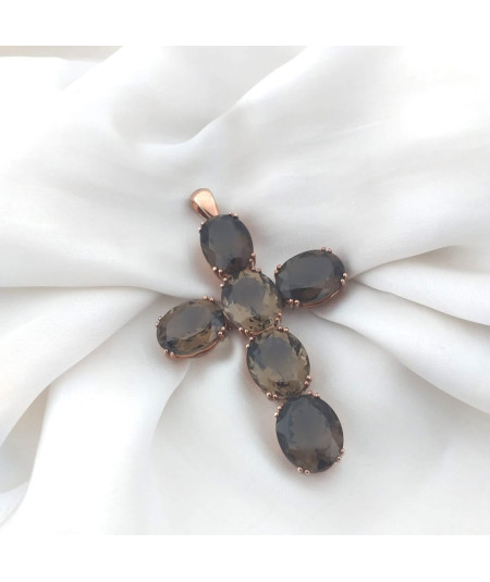 Cruz de plata rosada de ley y cuarzos fumée ovalados