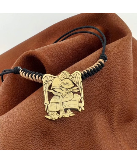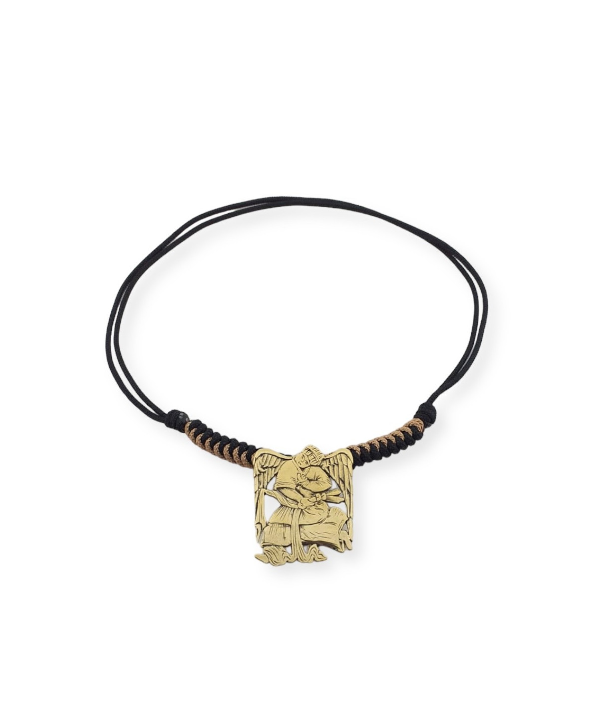 Colgante Ángel Persa de la Alegría en bronce con cordón corredero color negro y marrón.