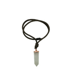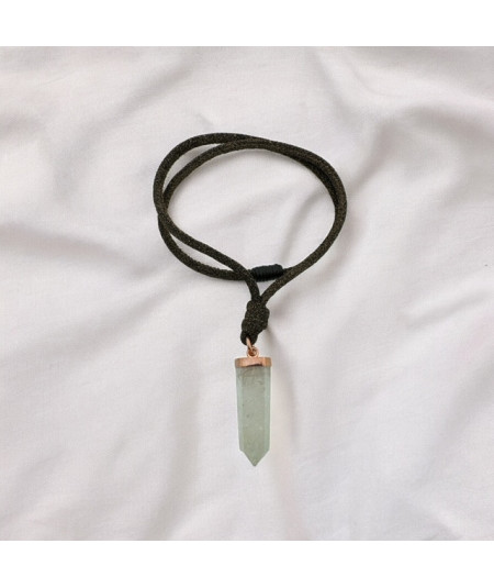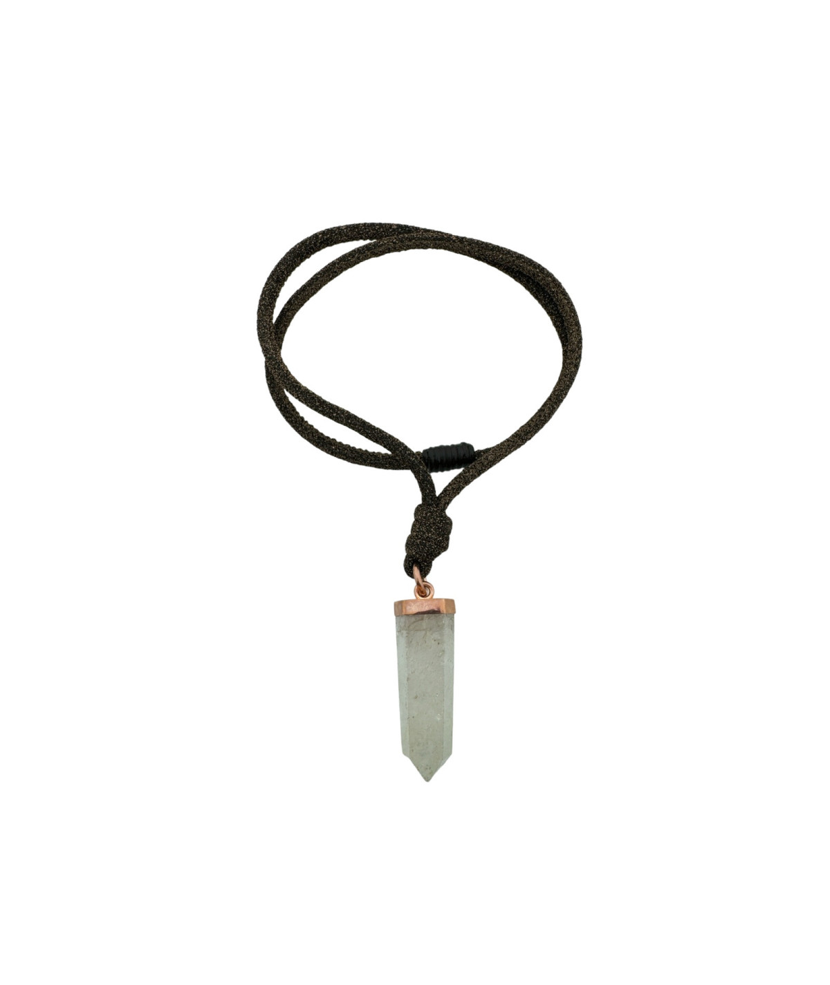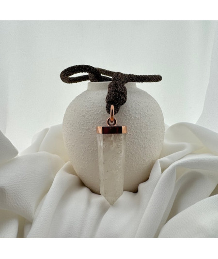 Colgante de cuarzo y plata rosada con cordón lurex color marrón.