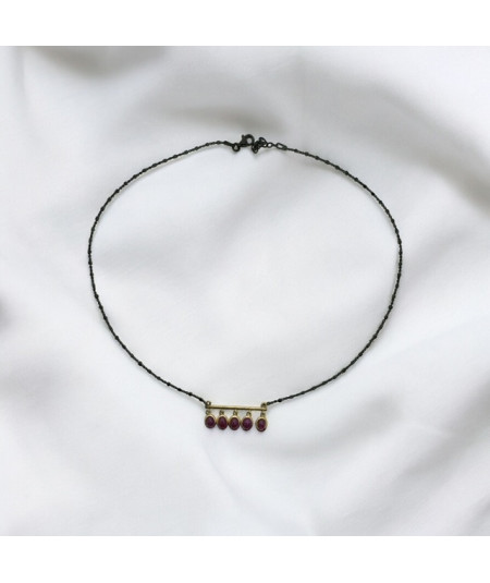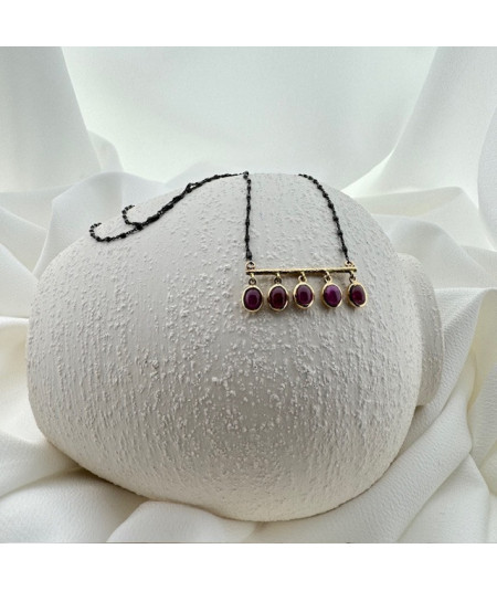 Colgante con 5 rubis cabuixón y cadena en plata de ley y barra de oro de 18 kt.