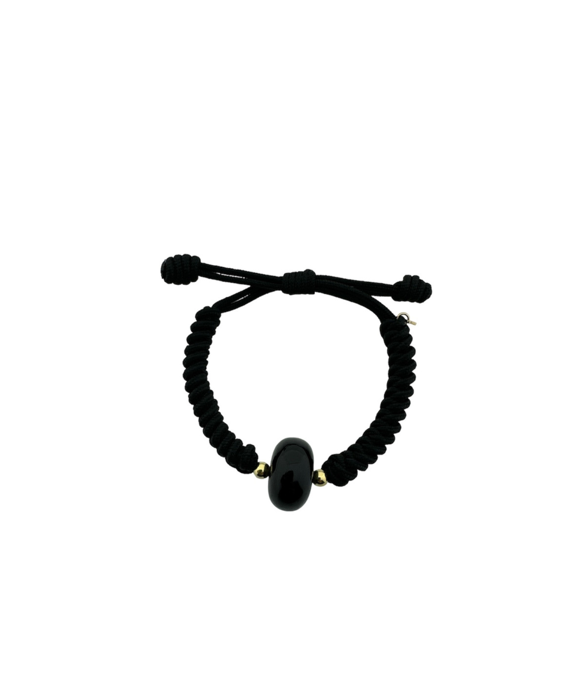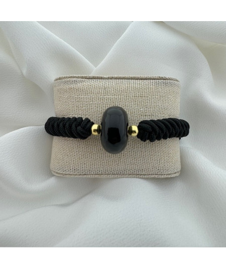 Pulsera con bola de ónix y piezas de oro18kt con macramé.