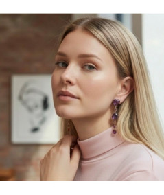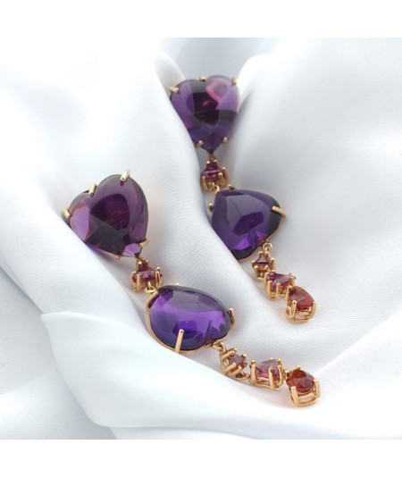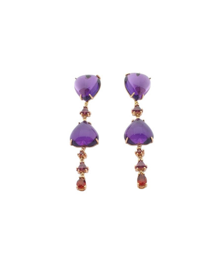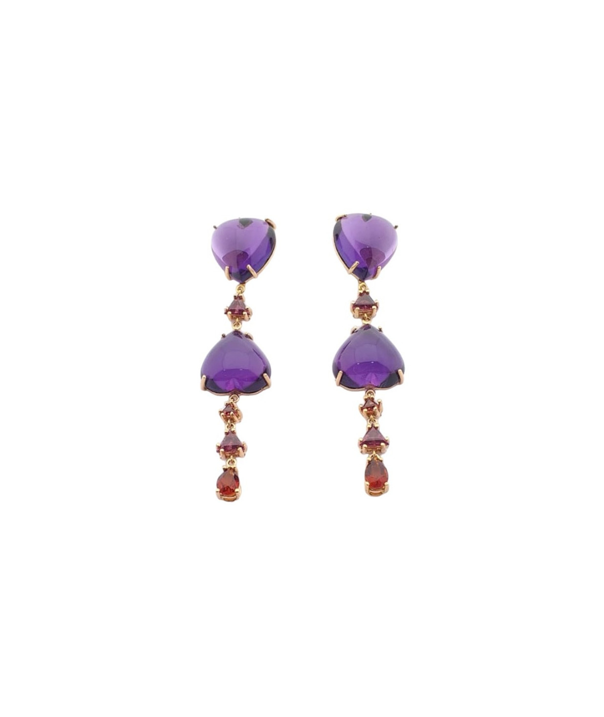 Pendientes oro 18 kt con corazones amatistas, turmalinas y perilla de granate.