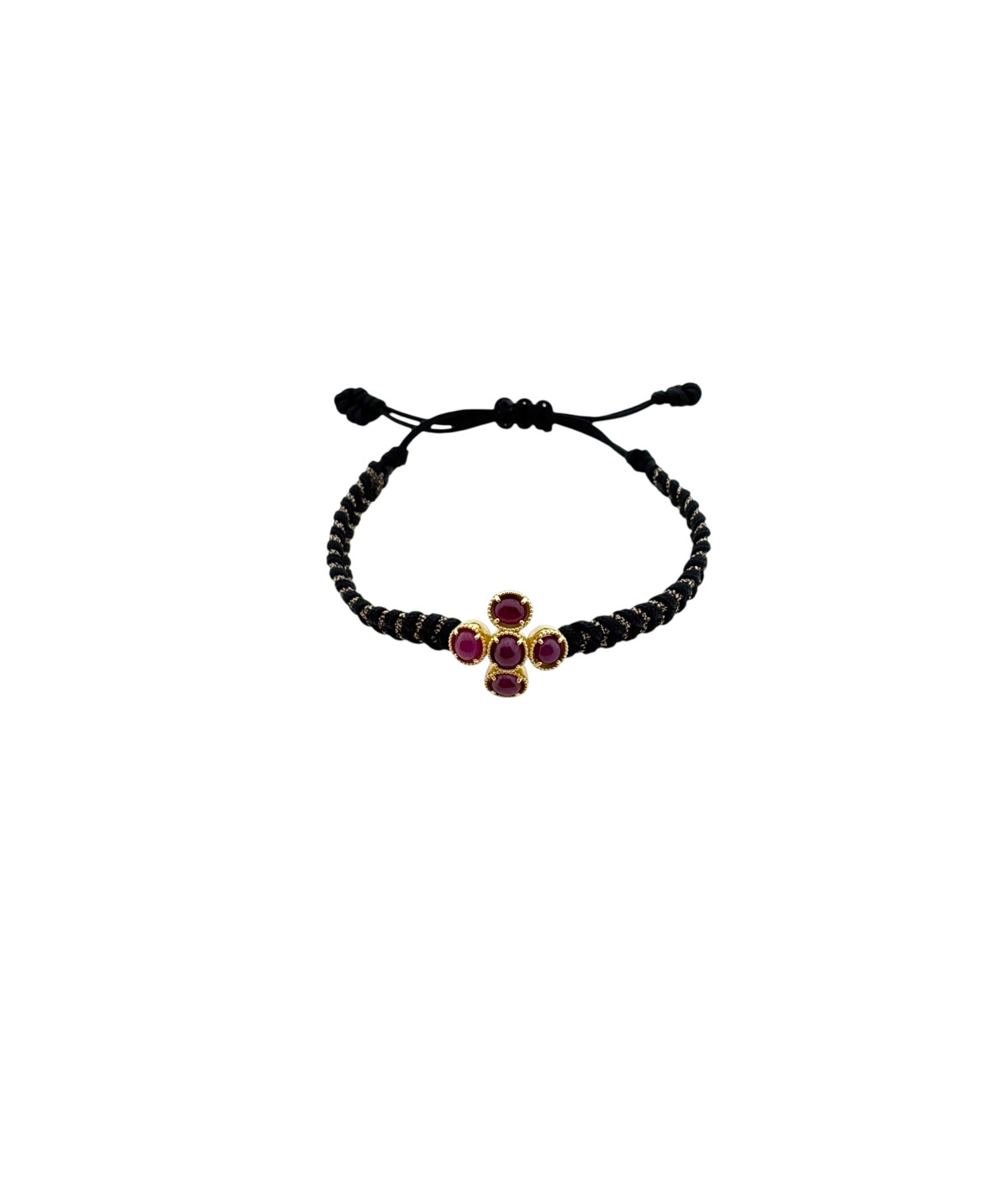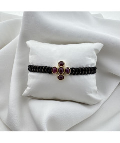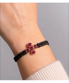 Pulsera oro amarillo 18kt y rubíes con cordón color beige.