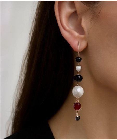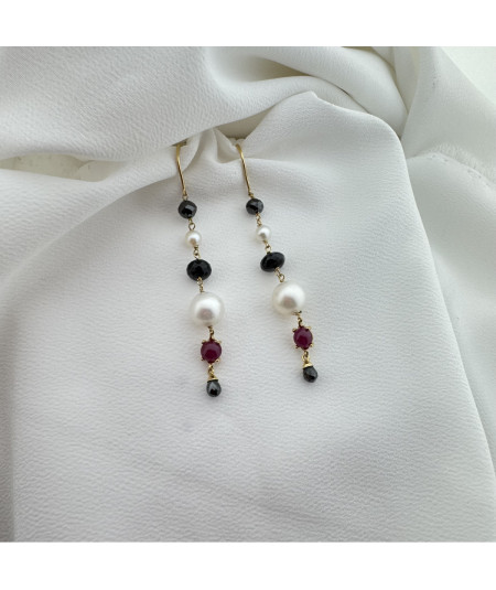 Pendientes oro amarillo 18kt con diamantes negros, perlas y rubís.