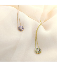 Colgante flor de 8 mm, en oro amarillo de 18 kt, con un diamante central color brown y rosetón de zafiros yelow con cadena de 42 cm de largo